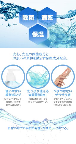 【商品名】アルコール洗浄タイプハンドジェル500ml 【内容量】500ml 【JAN】4562441906526 【アルコール濃度】58% 【成分】エタノール,水,グリセリン,カルボマー,TEA,メチルパラペン,フェノキシエタノール,EDTA-2Na 【用法・用量】手のひらに適量とり、なじむまで手全体にのばします。